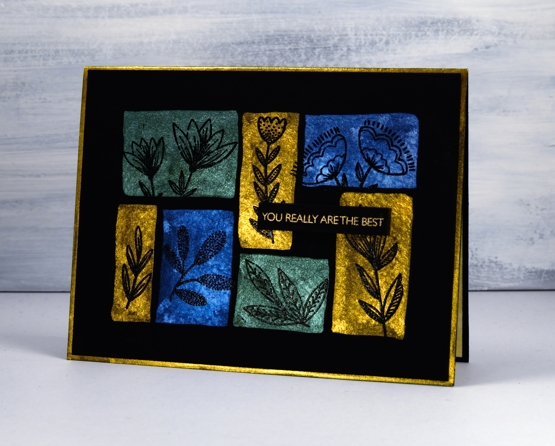 I embossed a sentiment from ‘million thanks’ on neenah black cardstock and popped it up over the painted shapes. I wanted a gold frame around the panel but could not find the exact gold in my stash so instead I painted the same gold paint from the Coliro earth set around the edges of the black card front. Painting your own mats and borders with matching ink or paint is a great way to get a perfect match.