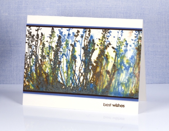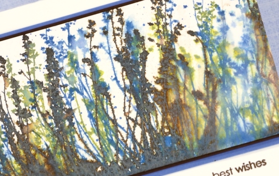 After stamping a water print onto the blended colour, I lifted the stamp and dabbed a paper towel over the print. It left a pale image on the coloured panel.