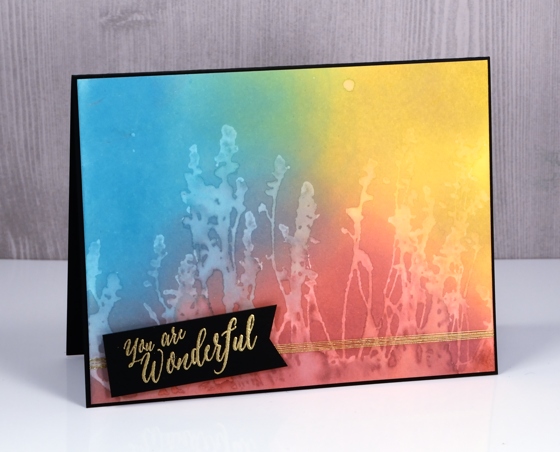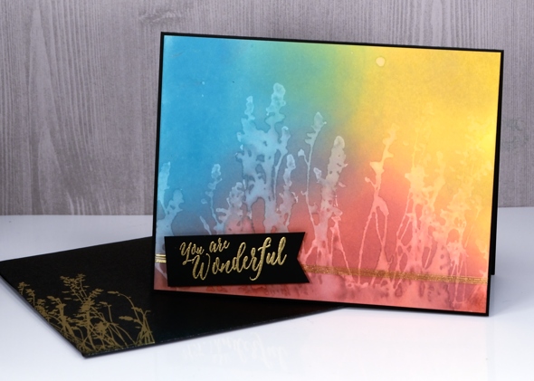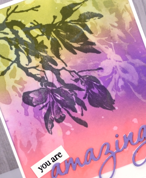 After sponging my colours over the whole panel I put the panel into my MISTI, positioned my stamp then spritzed it with water. All the stamps used for these cards are red rubber; (slapstick cling from Penny Black, names listed below) I haven’t tried with clear stamps yet. The stamp just has to hold onto the water for the technique to work.