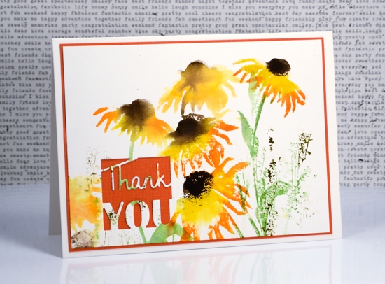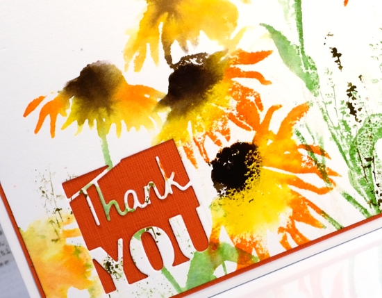 I was undecided about adding ribbon or a sentiment until I remembered this clever little die that cuts the negative space around the word ‘Thank you’ but does not separate it from the panel. It just added the interest I needed while showing more of the orange card stock I matted the panel with.
