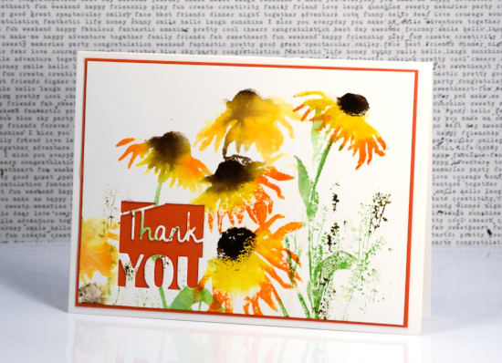 I still worked with a stamp positioner so I could add a colour at a time. I began by inking the petals in scattered straw distress stain, stamped then inked more of the petals in spiced marmalade, spritzed the stamp and finally while the petals were still damp in places I added ground espresso for the flower centres. I inked and stamped the stems and leaves in mowed lawn distress stain. When the daisies were dry I stamped some extra grasses with the ‘feathery’ stamp in forest moss and mowed lawn distress stain.