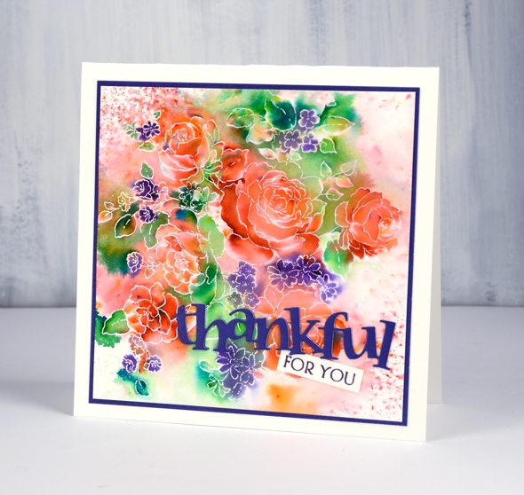 Next I used a trick I occasionally employ to flatten my watercoloured panels. I turned on my minc, popped the panel inside a folded piece of computer paper and ran it through the minc on a low heat setting. It ironed my panel nicely but also melted and removed some of the embossing. If I had used an embossing powder with some colour or shine then I wouldn’t have wanted it to disappear but clear or white embossing just masks the white paper underneath so melting it off didn’t change my design at all. The panel ended up very smooth so I was able to overlap the floral design with a sentiment stamped in versafine smokey gray ink. I matted the panel with co-ordinating pink cardstock and then added it to a square cream card base.
