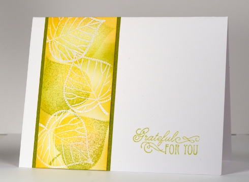 I liked the look of the blended leaf so I stamped several more then cropped one out to make a single popped up strip on the two layer card below.