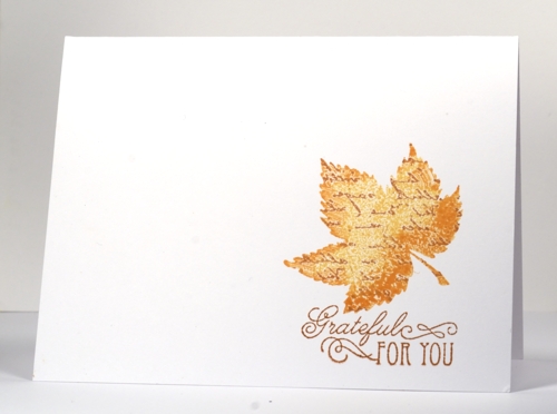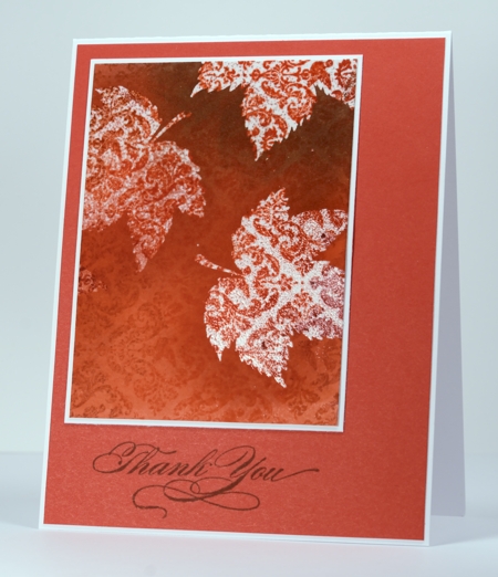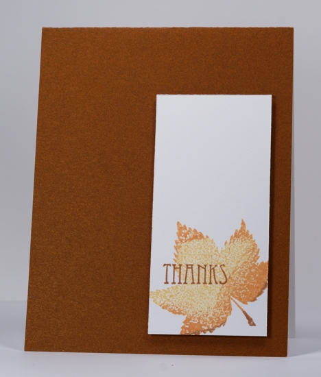 I embossed the outline leaf with clear embossing powder first then inked the solid leaf with yellow, green and a touch of orange before stamping over the embossed images. I finished the panel with some sponging before matting it and attaching to the card base.