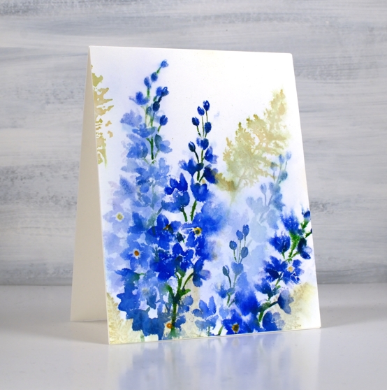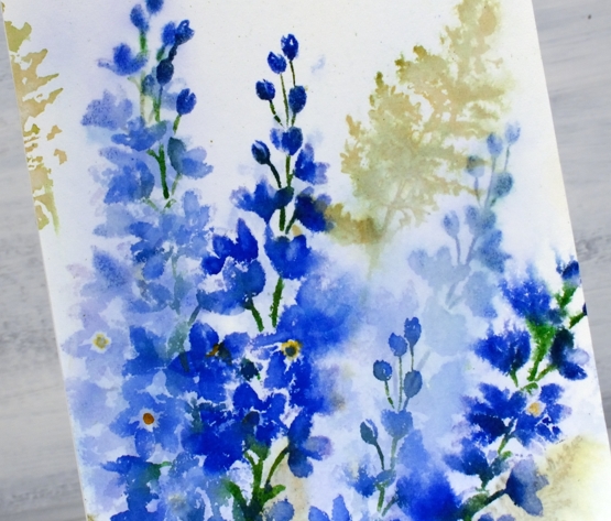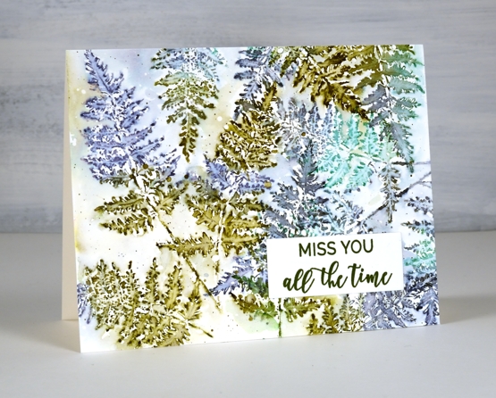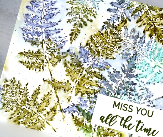 Once I’ve stamped the images I decide whether to blend further with a paint brush and water, for this card I kept it minimal but sometimes I do more blending for a looser watery look. I stamped the ferns after the flowers which required some partial stamping and as well as a little masking to make the ferns appear to be behind.