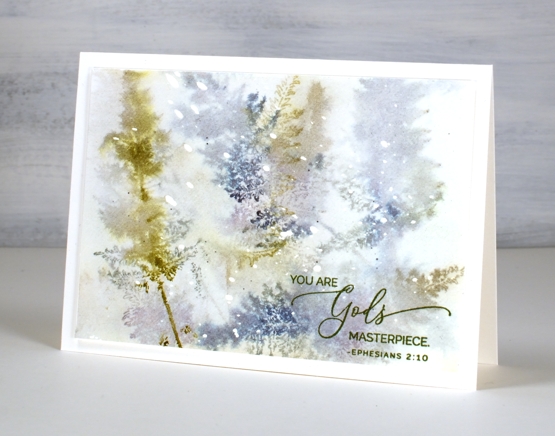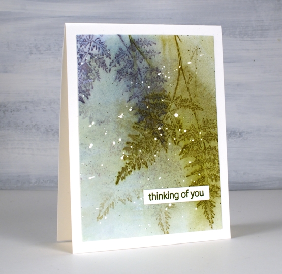 I think this second card is my favourite; I know it is very diluted and abstract but the glimpses of fern appeal to me even more than whole fern images. I stuck with forest moss and chipped sapphire because they are always winners and added iced spruce. I stamped on partly wet watercolour paper and dabbed the stamping dry before repeating the process.