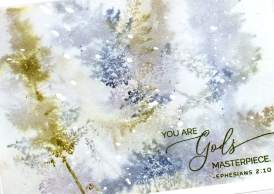 After painting and blending inside all the stamped images I used blending brushes to add iced spruce to two edges and splattered some over the panel. I trimmed and popped up the panel on a white luxe card base.