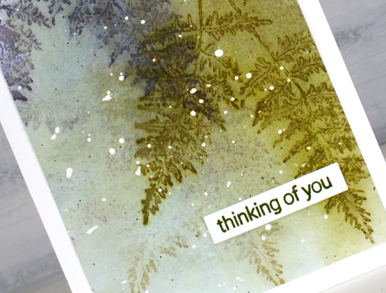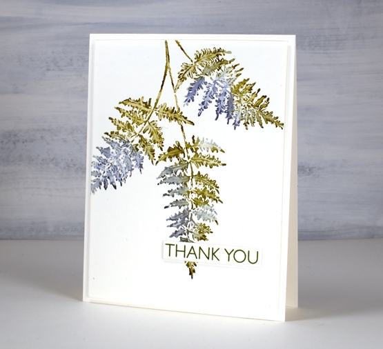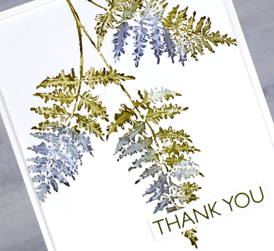 Same three inks and a size 0 paintbrush were all I needed for this very clean print of the ‘fresh fern. I popped a sentiment from PB ‘million thanks’ up over the tip of the fern and kept it all very simple.