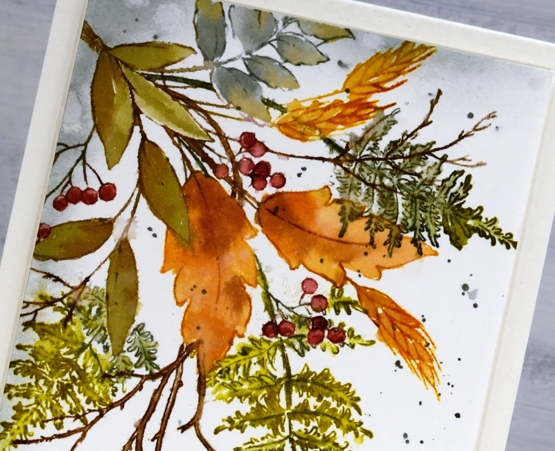 I kept the autumn bouquet stamp in the positioner so I could stamp each element one at a time. There are three types of leaves plus the wheat and the berries. All were done with a combination of inks. Often I ink the image using markers then smoosh the corresponding ink pad on my glass mat to give me ink for painting inside the stamped image.