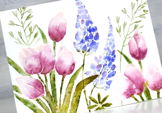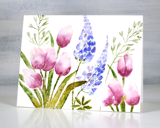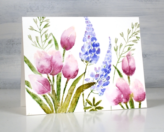 Once again I worked on hot press watercolour paper with distress inks. I usually spritz the stamp lightly with water before stamping then use a paintbrush to blend the inks or dilute them. The inks I used are listed below; I had seedless preserves as the main colour on the tulips and the highlight colour on the lupins. The technique for this card is featured in my online class Floral Faves which is still on sale for 30% off as part of my Moving Day Sale.
