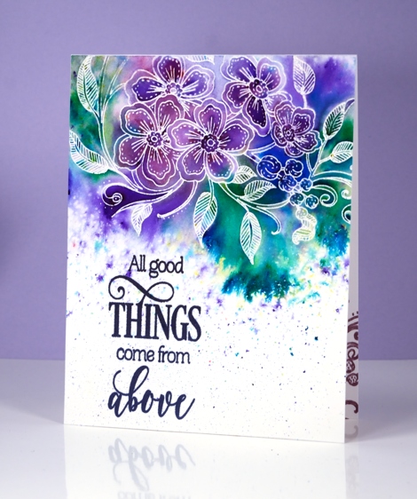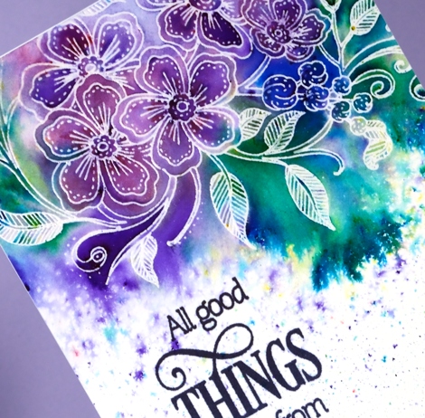 Today’s card features one of the new colouring book style images from Penny Black. I chose to let brusho powders do the colouring for me. I embossed the stamped image off the top of the watercolour paper using versamark and clear embossing powder. I taped down the top and sides of the panel to prevent warping when I added water to it. With brusho you can add water first or powder first. For this panel I started by sprinkling powder over the embossed panel; I was selective in where I sprinkled it so I would get purple flowers and green leaves but I knew there would be soft blending between the colours anyway. I spritzed from above and from the side to spread the colour down beyond the stamping.