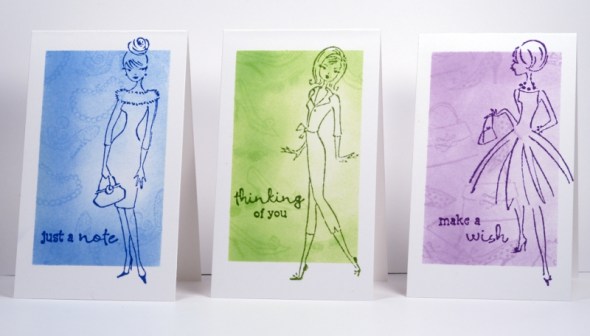 My little cards are 2 ½” x 4 ¼” . I masked each one on all four sides then sponged in a light colour before stamping the accessories randomly in the same colour. After removing the post-it masks I stamped the girls and sentiments from the Wishes set in a darker shade.