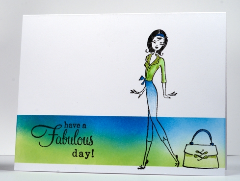 I have used the girl and purse from “Hello Gorgeous” and a slightly altered sentiment from Sweet Wishes. I covered part of the word “birthday” with a post it note so that I could wish someone a fabulous day!