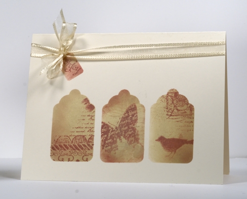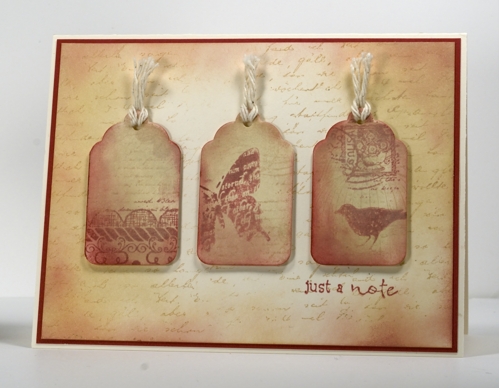 To keep it one layer I punched a tag mask out of a post it note and sponged a base of Wheat Chalk ink inside the mask. All the stamps are from the Free Flight set except the tiny sentiment. I used the collage stamp to add background to each tag and then used the bird and butterfly as well as the lace edge and the postal part of the collage to be feature images.