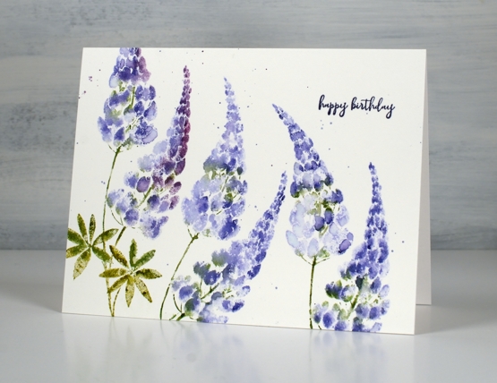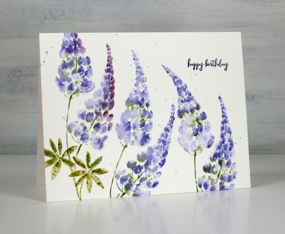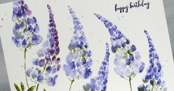 The new lupin stamp from Penny Black is called ‘distinctive’ and it has two flower heads on one stem. I used shaded lilac, chipped sapphire and seedless preserves to ink the stamp so I could create lupins that are a close match to the ones that appear in my garden. The leaves and stems were inked with mowed lawn, forest moss and peeled paint distress inks. You can see in the close up that I have a mix of blended and unblended sections on the card. I used the misti, spritzed the stamp after inking and also did a bit of blending with a paintbrush after stamping. I think the mix of textures add to the appeal and adding some water helps the ink spread on the hot pressed watercolour paper.