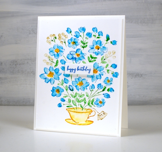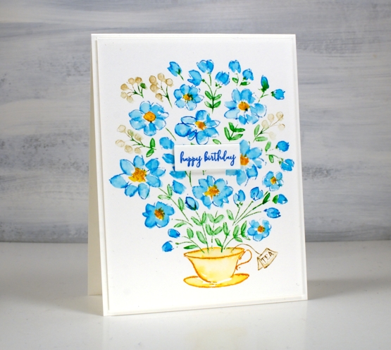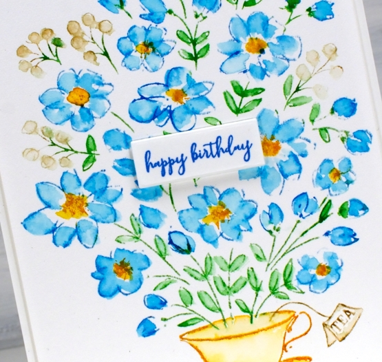 I used a paintbrush and water to pull ink from the stamping to fill the petals and leaves working loosely but taking care not to blend much from one ink to the next. Blue and yellow make green as you know and I didn’t want the petals or centres turning green.