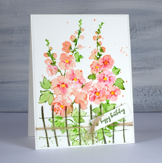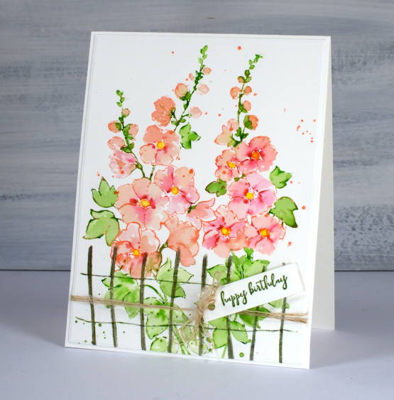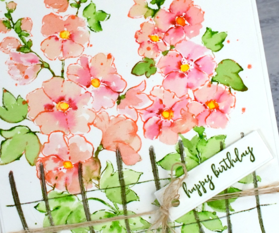 As usual I worked in the stamp positioner with hot pressed watercolour paper. I first inked the centres of the open flowers with a dark red zig clean color brush marker, spritzed with water and stamped. Next I inked the stems and leaves at the top of the image with a green zig marker and stamped. I used saltwater taffy distress ink to ink all the flowers wiping ink off where I could see there were leaves. This is a bit of a tricky step but a bit of green in the wrong place can usually be diluted and dabbed off with paper towel. I blended all the petals with a paintbrush pulling the dark red ink into the paler pink. When stamping the lower leaves with mowed lawn distress ink the fence ended up green so I went over that with some hickory smoke ink and a paintbrush. When I was sure the flower petals were dry I added yellow to the centres just like my reference photo. To finish I splattered some green and taffy ink, added a little greeting from the PB ‘how sweet!’ set and tied some twine to fit in with the little fence.
