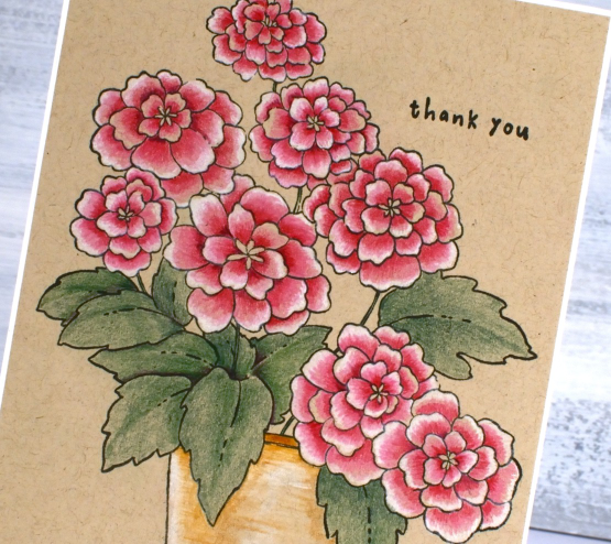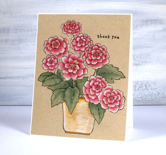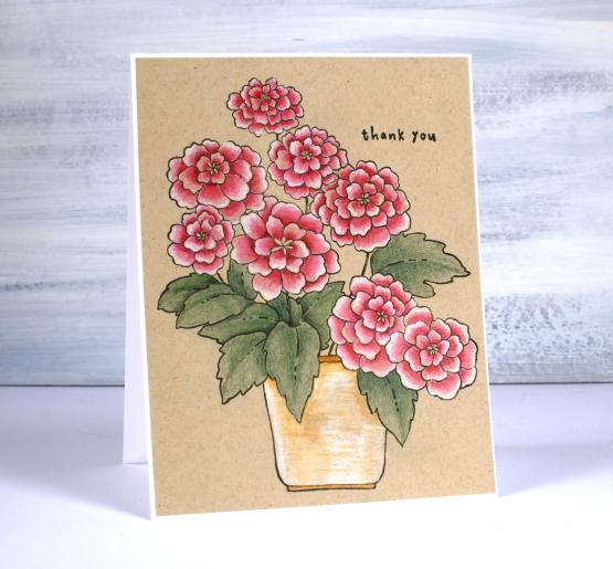 This is the new ‘potted pretties’ stamp from Penny Black; it is pretty isn’t it? Although I love the soft blends of loose watercolour I also find pencil colouring very satisfying too, especially on kraft cardstock.