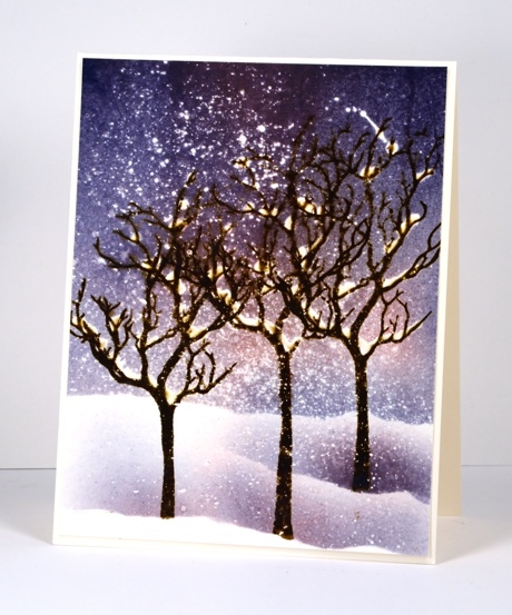 Posted: November 12, 2015 Filed under: Joy to All, Stamped Landscapes | Tags: Canson watercolour paper, Penny Black stamps, Ranger Distress inks 12 CommentsWhen I first featured this tree stamp I said I would be back with more designs but then forgot this one was waiting in the wings. I started this one with masking fluid, quite a bit, splattered over the panel. Once the masking fluid was dry I stamped the trees in brown dye ink then painted masking fluid on some of the branches. When that was dry I positioned a mask two thirds down the panel so I could brayer the sky with blue and pink inks. I removed the horizon mask and used smaller masks below the tree trunks to sponge some snow drifts. I looked for a place to add a sentiment but decided to leave it blank on the front and add something later inside.