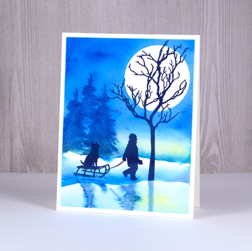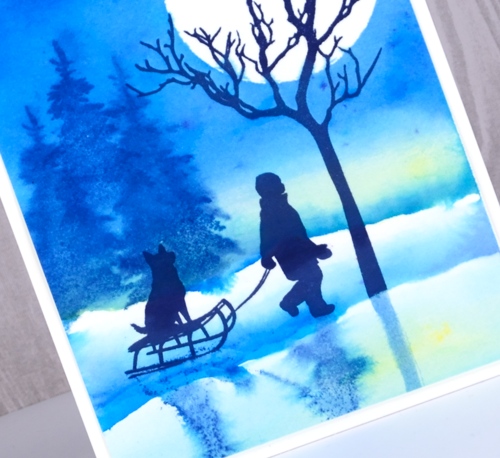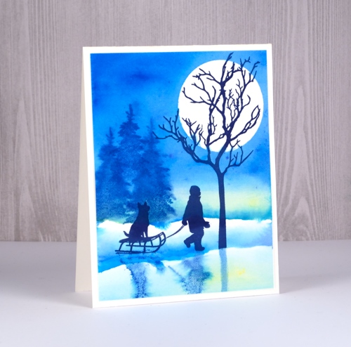 To create the shadow of the boy and his sled I inked the stamp with memento Danube blue and stamped it onto an acrylic block. I stamped the block into the damp watercolour paper where it created a blurred mirror image. I painted straight shadow for the tree also in Danube blue ink. When the ink and paint were dry I removed the moon mask and attached the panel to a natural white card base.