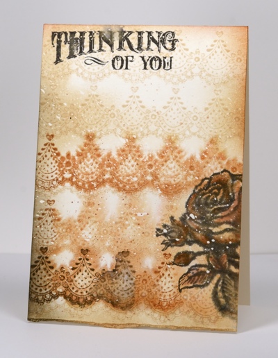 This new lace set from Penny Black is very pretty; there are seven different lace trims to play with. I thought they would be perfect for a vintage card. Before any stamping I flicked masking fluid over the piece of watercolour paper and let it dry. Next I wet the whole piece of water colour paper then stamped the lace stamp in Memento Desert Sand to fill the panel. When it had dried a little but was still damp I restamped some lace in Memento Potter’s clay and finally a small portion in Espresso Truffle. I added the rose in Espresso Truffle also, then used a marker and aqua painter to blend some colour onto the leaves and petals. I added the sentiment when the panel was dry but dropped a few water droplets on it for a little bleeding. When it was all dry I tore the bottom edge, sponged all the edges, added some spots of Potter’s Clay ink then removed the masking fluid to reveal little white flecks and specks.