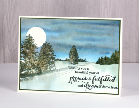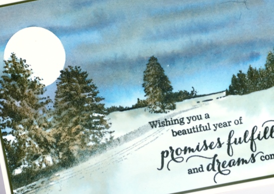I used some diluted northern pine ink to give the foreground snow a bit of colour and shadow then dried the panel. I finished off the card with a sentiment from the ‘love & peace’ set stamped in versafine olympia green and a dark green mat before attaching the panel to a natural white card base.