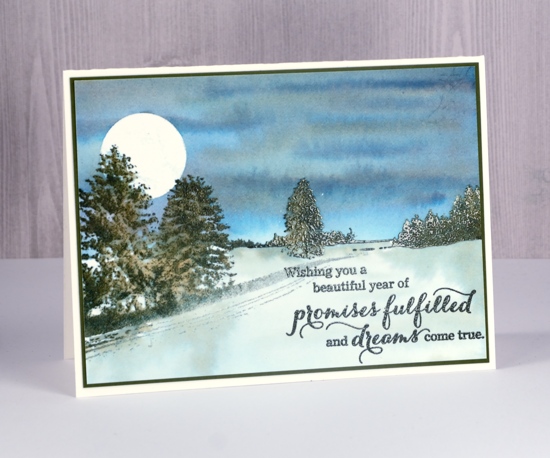I placed some masking tape across the birch trunks then stamped the distant trees stamp from the ‘peaceful winter’ set in nocturne ink. The distant trees gave me a horizon line above which I painted my distress ink sky. I pressed both wilted violet and blueprint sketch inks onto my glass mat, added a little water and painted the sky. By letting the ink dry slightly between applications I was able to get some darker ‘dried’ lines in the sky. Once the sky dried I removed the moon mask.