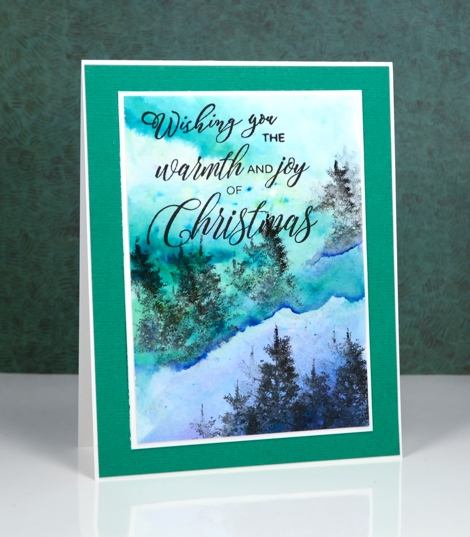 You will probably recognise another favourite tree stamp of mine in the background of this scene, it’s the little tree from the ‘Prancers’ set. I created a video to show you how I made this scene which features some watercolour effects along side some pigment ink stamping. I chose to pair pigment inks, which are waterproof, with watercolour painting so I could have pretty blends in the sky and snow but sharp tree images in the foreground and background.