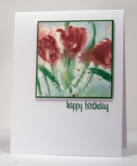 Posted: February 7, 2014 Filed under: CAS, Promise Me, Watercolour | Tags: CAS, Fabriano Watercolour Paper, Penny Black stamps, Tsukineko Memento inks 7 CommentsThis lovely tulip stamp is just one of the six new ‘brush stroke’ stamps in the new Happy Everything catalogue. Surprise, surprise I chose to watercolour with it. This time I used the ‘wet into wet’ technique described in my recent butterfly tutorial. I inked the stamp in green and plum then pressed it onto wet watercolour paper. All the colour in the background of the panel was created this way right at the beginning. When the paper was almost dry I re-inked the stamp and stamped it again this time achieving the more defined flower heads and leaves. I picked up some green and some plum ink on a paintbrush and flicked it onto the panel when totally dry.