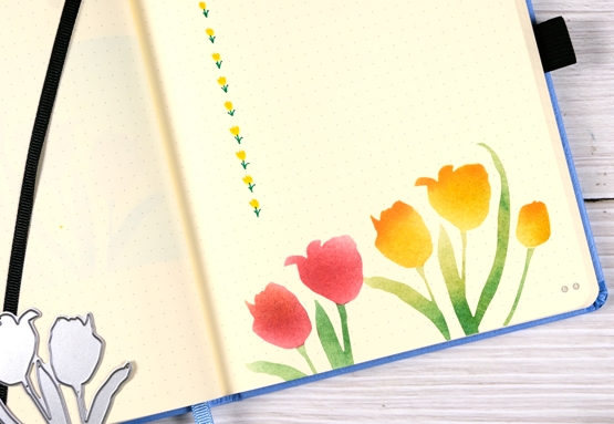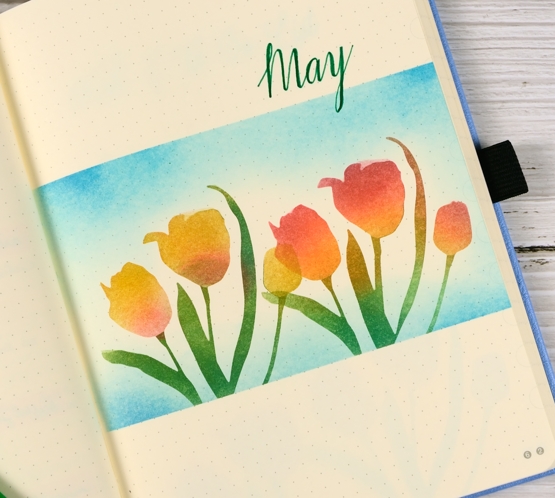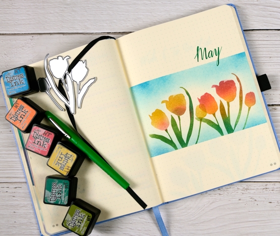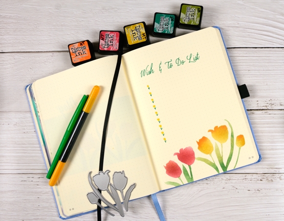 I blended distress inks with blending brushes and got better at protecting the leaves while blending the flowers by the time I did the wish/to-do list page. I drew little stems in green then used the brush tip end of the staedtler brush pen to make the yellow tulip petals.