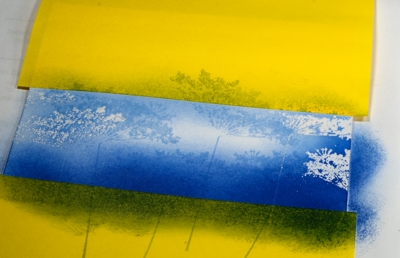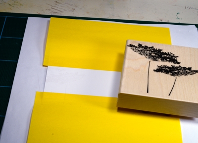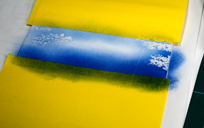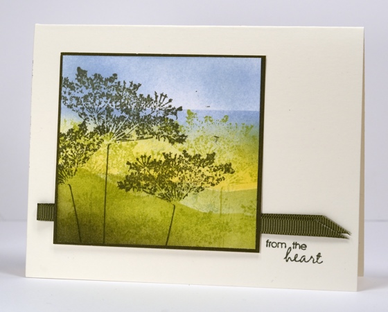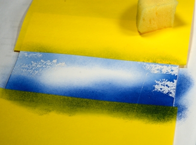 I sponged blue on the top third of the panel, green on the lower third and yellow in the middle. I then cut a hill shaped mask and sponged green below the mask, re-positoned it and sponged a second paler hill behind. I stamped the Queen Anne’s Lace in two green tones then finally positioned the straight mask to create the ocean in the distance.