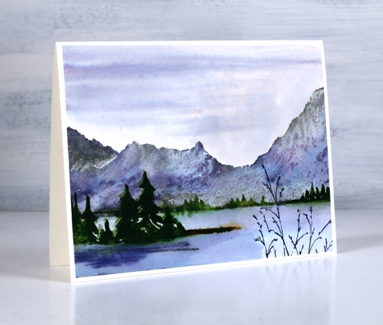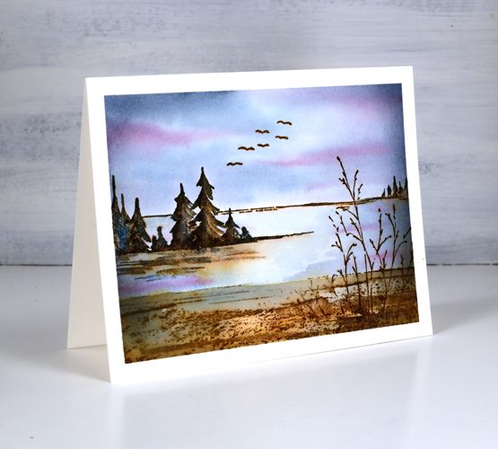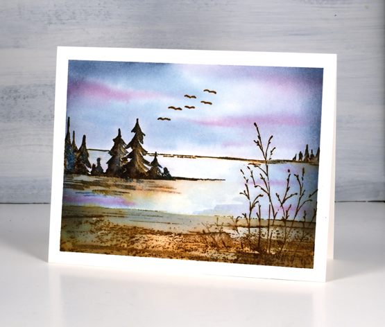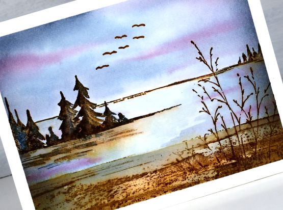 This scenic stamp from Penny Black is called Quietude and I think it is aptly named don’t you? I would be happy to wander along the shore of this lake today. It is getting cold, just on the edge of beginning to freeze but not there yet. The plants have died off but they are goldy brown colour, so still eye catching against the steely blue water. Okay, that’s enough waxing poetic for me. I plan to stamp and paint this as a winter scene soon but I enjoyed turning it into a late fall scene first.