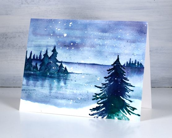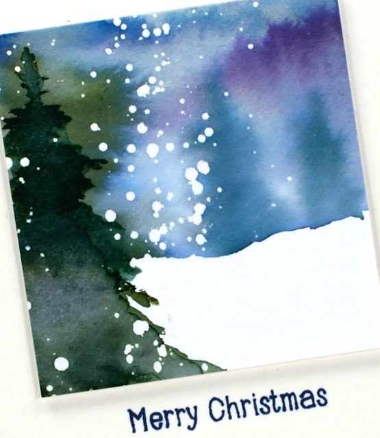The falling snow on both cards is a result of splattered masking fluid on hot pressed watercolour paper. I splattered it ahead of time and did all the stamping and painting before rubbing it off to reveal all the white dots.