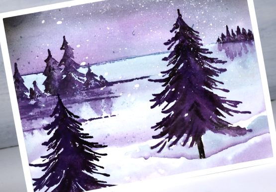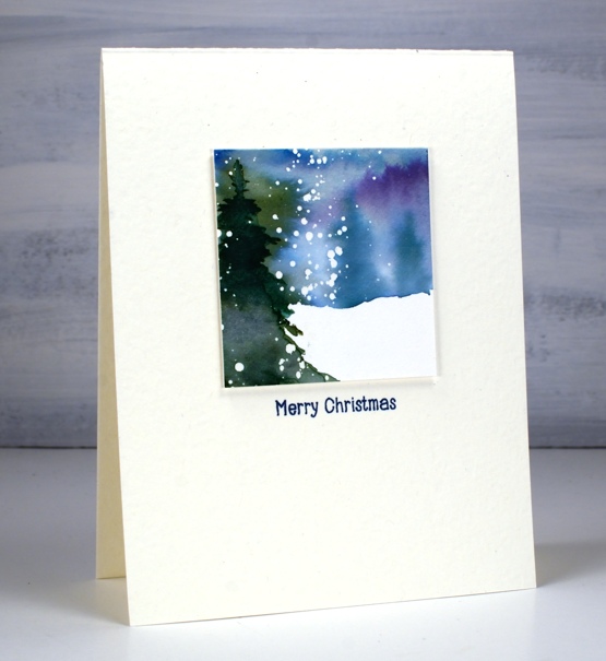 I found myself needing a few more Christmas cards this week so I spent a pleasant couple of hours creating mini snowscapes with a handful of stamps. I taped a piece of hot pressed watercolour paper that was already splattered with masking fluid in quarters and kind of worked on the four panels at the same time. I used some of the techniques featured in my new WINTER WONDER online class but on a smaller scale.