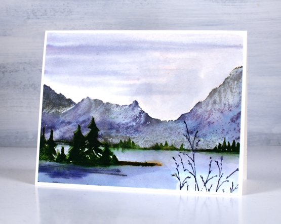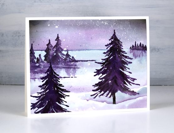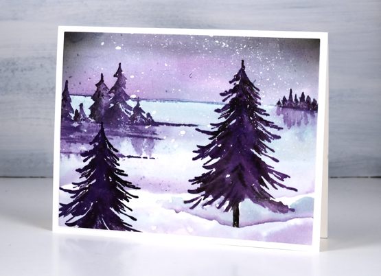 In this snowscape inspired by my friend Liz’s love for all things purple, I used speckled egg, dusty concord and black soot distress inks to paint a sky, a lake and snowbank shadows. I stamped the top of the scene first in speckled egg so I would know where to paint the sky then used a paintbrush and smooshed ink to fill the area above the horizon. I dried that then painted the lake area with speckled egg and dusty concord before stamping the trees in dusty concord and black soot inks.