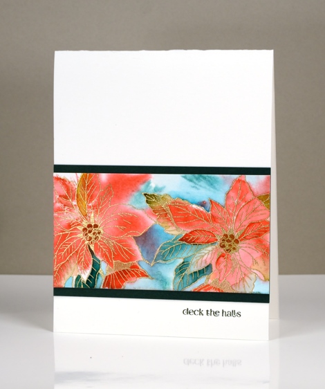 The gold poinsettias are cut from gold wrapping paper using the “Joyful” dies. Before cutting I applied an adhesive sheet to the back of the paper so I could easily stick the flower and stem onto the card. The effect looks a little like gilding because the paper is so much thinner than cardstock. The word ‘joy’ is also cut from the same wrapping paper.