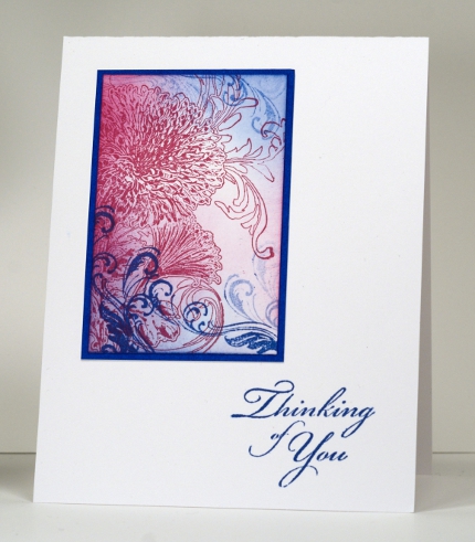 Posted: April 23, 2012 Filed under: CAS, Penny Black, Resplendent 14 CommentsSometimes a stamp really needs no help at all to be the star of a card. The Penny Black stamp, Resplendent, is one such stamp. Although the whole stamp is quite large I have just used a section of it to create this pink and blue panel. Resplendent is stamped in pink and the little flourish from the Gratitude set is stamped in blue. I added both blue and pink sponging and a mat before adding the sentiment, also from the Gratitude set, to the card base.