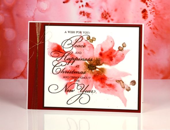 I added a small sentiment below the panel in a matching ink. On the red panel above I didn’t try to keep leaves green and petals red; everything is red. On the pink poinsettia below I used a few more distress inks in my initial loose watery impression.