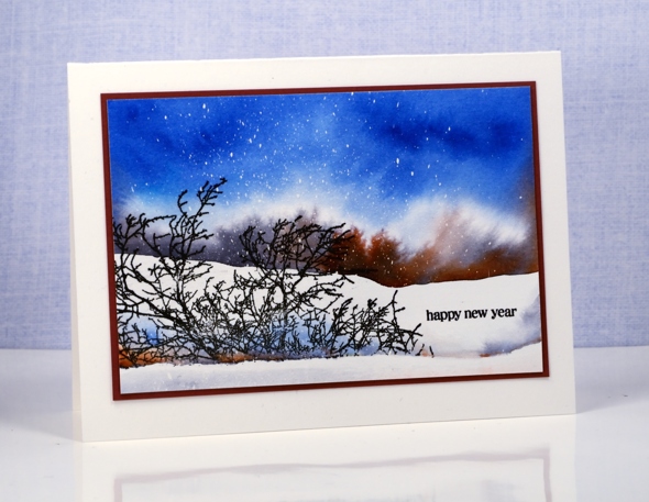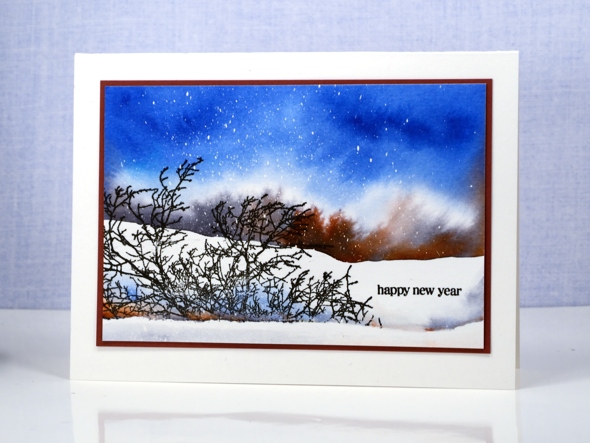 Posted: December 31, 2016 Filed under: Skyward, Stamped Landscapes | Tags: Peerless Transparent Watercolors, Penny Black stamps, Tsukineko Versafine inks 15 CommentsThe scene on today’s card is not unlike what I see around Ottawa. Sometimes the sky is bright blue; it usually means the temperature is very cold. The landscape is covered in white but the trees tend to be a mix of black, grey and sometimes brown, the deciduous ones that is. I splattered masking fluid over a piece of watercolour paper to create the look of falling snow; if the sky had been darker it could have looked like either snow or stars. I then used Peerless watercolours to add colour. I began by painting a line of water across my panel; that line became the edge of the background snowbank. I picked up grey paint and added it to the water then brown so the colours spread and feathered. I added more water above the grey and brown then started painting blue from the top of the panel slowly pulling it down and diluting it with water. I didn’t want the blue to mix with the grey and brown so I kept the edge of both colours diluted with water and tipped my panel towards the top so colour would move upward not down.