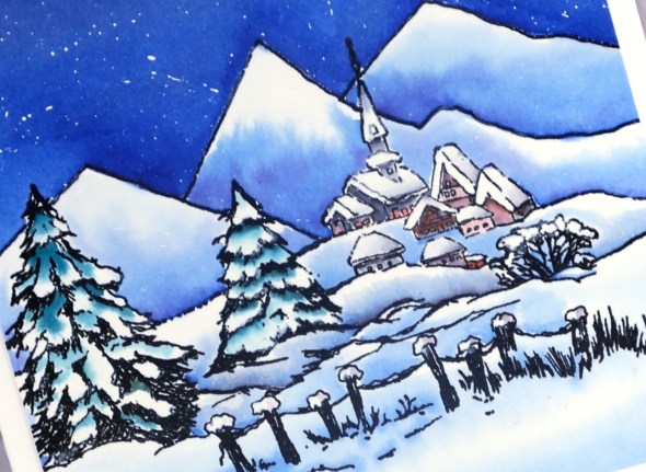 Posted: December 6, 2017 Filed under: snow covered, snowy village | Tags: Peerless Transparent Watercolors, Penny Black creative dies, Penny Black stamps 2 CommentsThe second of my winter landscapes this week combines two outline stamps, the little village in the background is from the ‘snowy village set’ and the trees and fence stamp is from the ‘snow covered’ set. I stamped both stamps in versafine onyx black ink onto hot pressed watercolour paper. To make sure the two stamps created a cohesive scene I extended some of the snow bank lines with a black embossing pen both to the right of the village and to the left behind the trees then added some mountains in the background. I embossed all the stamping and pen work with clear embossing powder.