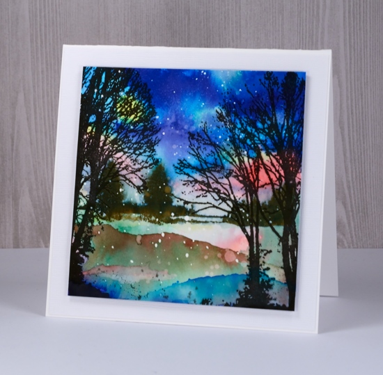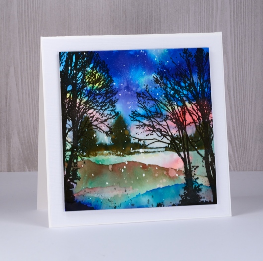 Posted: November 4, 2017 Filed under: peaceful winter, snowy village 11 CommentsWould you believe some new tree stamps join my collection? You can never have too many! These two artistic silhouettes are not two halves of the same tree as you might first think but two separate stamps by Penny Black which come in a set of three, Snowy Village, including a little village stamp that would look cute in the distance between the two trees. My scene leans a little more to the whimsical side of things with a multicoloured starlit landscape.