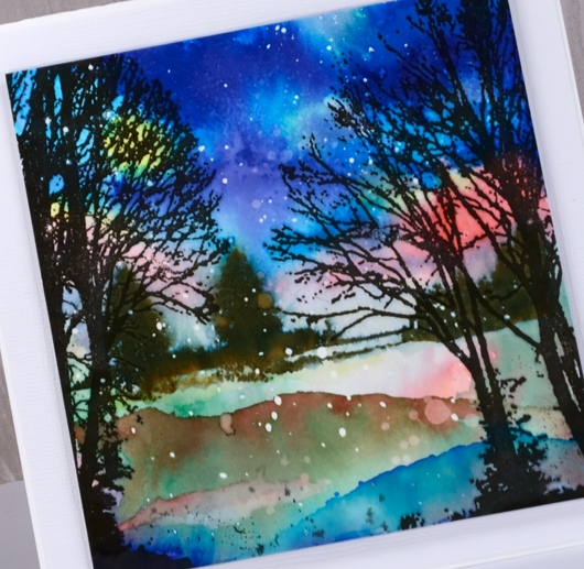 I started by splattering masking fluid over a piece of hot pressed watercolour paper. When it was dry I used a stamp positioning tool to stamp the two large trees on either side of the panel. The stamp positioner made it possible to stamp several times with versafine onyx black ink so I had completely black images. Once the ink dried I began painting with a range of Ken Oliver’s colorburst powders. I tapped a tiny bit out of a bunch of bottles into a palette then added a drop of water when I was ready to use that colour. I began by painting a section of water in the middle of the panel which stayed fairly light as I added colour above and below. I used mainly blues and pinks above the horizon with a spot of yellow here and there. Below the horizon I added more green and painted some hard edges to suggest gullies and rises. I let the panel dry a bit but not completely before I stamped a strip of distant trees in memento northern pine ink. The strip of trees is from another new PB set, Peaceful winter. As the panel was still damp the background trees softened and bled into the surrounding area.