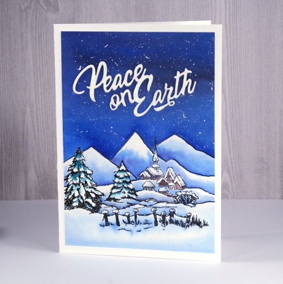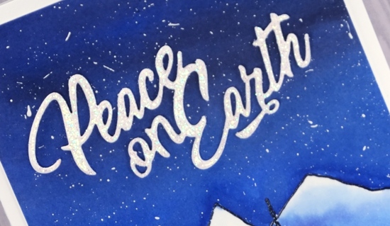 As the sky filled almost half the panel I decided to create a large sparkly sentiment. I cut the ‘peace’ die from white cardstock three times and embossed one with clear sparkle embossing powder. I added glue to the back of each die cut and stacked them on top of each other. I have found the easiest way to get them to line up is to squeeze the layers together from above with a pair of tweezers. It is a quite large card so I did a side fold rather than my usual top fold.
