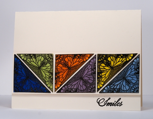 This little butterfly corner reminds me of Art Nouveau tiles and decorations. To create this card I stamped the corner six times in versamark and embossed in black before sponging each corner with a different Memento ink. I realized after that I could have just embossed the corner on six different colours of cardstock; might have been more straightforward don’t you think?