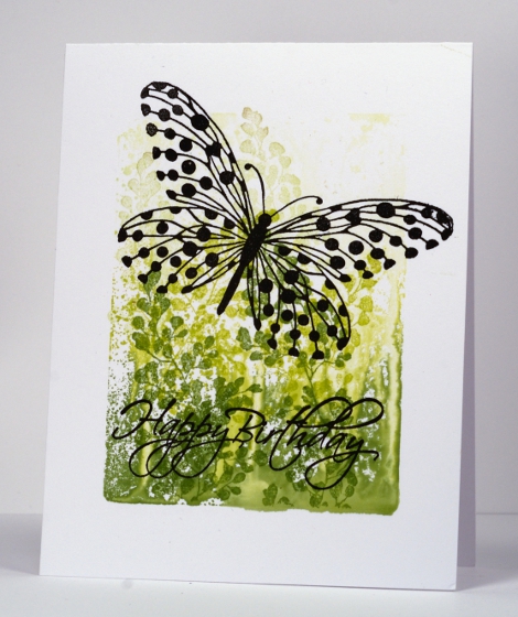 Posted: July 12, 2012 | Author: Heather | Filed under: CAS, Social Butterfly | 21 CommentsI have seen a few cards lately with backgrounds made using acrylic blocks so I decided to give it a try. I dabbed ink onto the block using the memento dew drop inks then spritzed it with water and let it blend and run on the block before stamping the block onto the card base. On top of that I stamped the maidenhair several times in three greens before completing the scene with a black butterfly and sentiment. I have seen similar backgrounds with a lot more colour and ink so I will continue experiment with the technique. We are enjoying gorgeous summer weather this week and I am seeing some butterflies too.