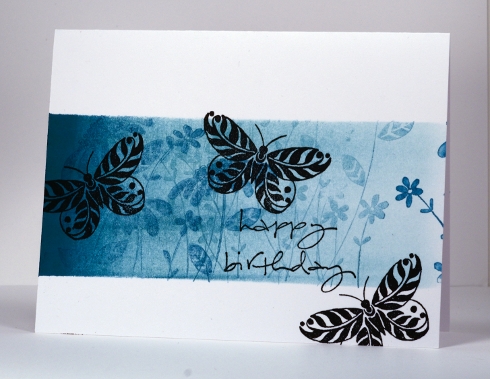 I masked the right side of the card with a large post-it note then added a smaller post-it to make the indent. The butterfly area is sponged and stamped with memento inks.