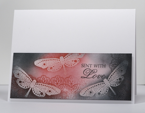 Posted: September 24, 2012 | Author: Heather | Filed under: CAS, Lace Delight, Penny Black, Social Butterfly | 23 CommentsNo snow or leaves today; I pulled out the pretty little dragonflies and some lace instead. I did some random sponging in pink and grey before I stamped the dragonflies over the top in versamark and embossed in clear. I then sponged again in pink and grey and added the lace border stamp on two sides of the panel. The panel is popped up on dimensional tape.