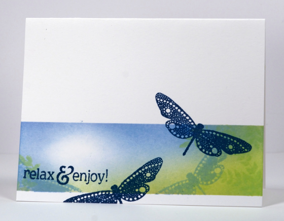 Posted: November 13, 2013 | Author: Heather | Filed under: CAS, Social Butterfly, Verdant | 8 CommentsI am back in Canada now. Having not had a chance to do any stamping, I will share another card from my classes earlier this year. This simple one layer card features that same layout I use over and over. I masked the top and bottom with post-it notes then sponged in pale green and pale blue leaving an area free of colour as a light focal point. I added some foliage stamped in green and a couple of dragonflies stamped in blue. Finally I removed the masks and stamped dragonflies and sentiment in a darker blue.