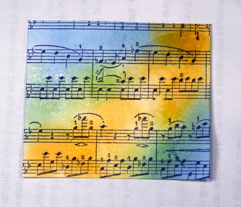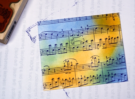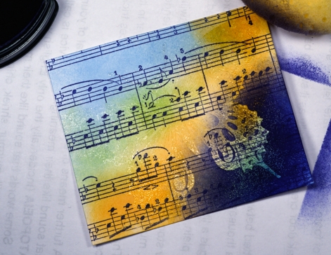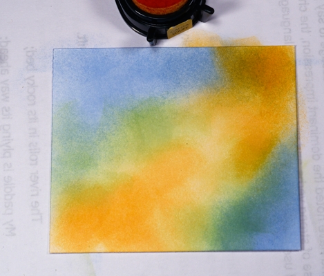 First I sponged three colours randomly over a piece of white cardstock. Careful blending is not important because the sponging will be stamped over and responged.
