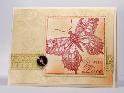 The butterfly is stamped in Rhubarb on ivory, the letter back ground in Desert Sand and the sponging done in both colours. The edges of the butterfly panel and it’s mat are distressed. I found some vintage lace to put behind the butterfly and one burgandy button (which unfortunately looks dark brown in the photo!) to finish it off.